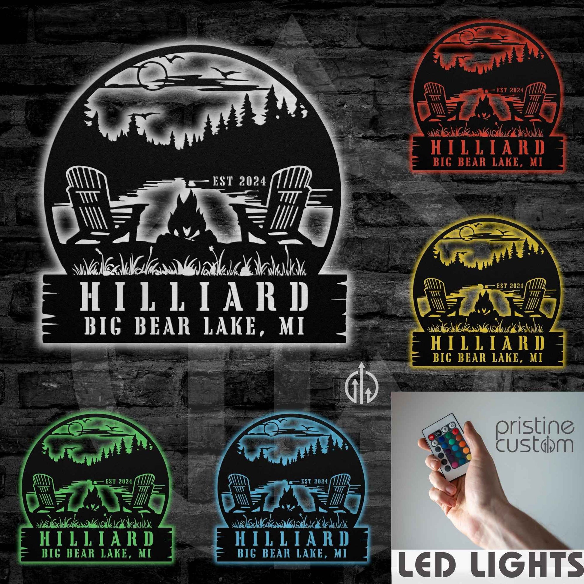 This custom sign captures the essence of lakeside relaxation with a detailed campfire, chairs, and trees design. Perfect for adding a personal touch to your family's lake house.